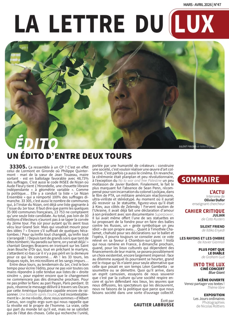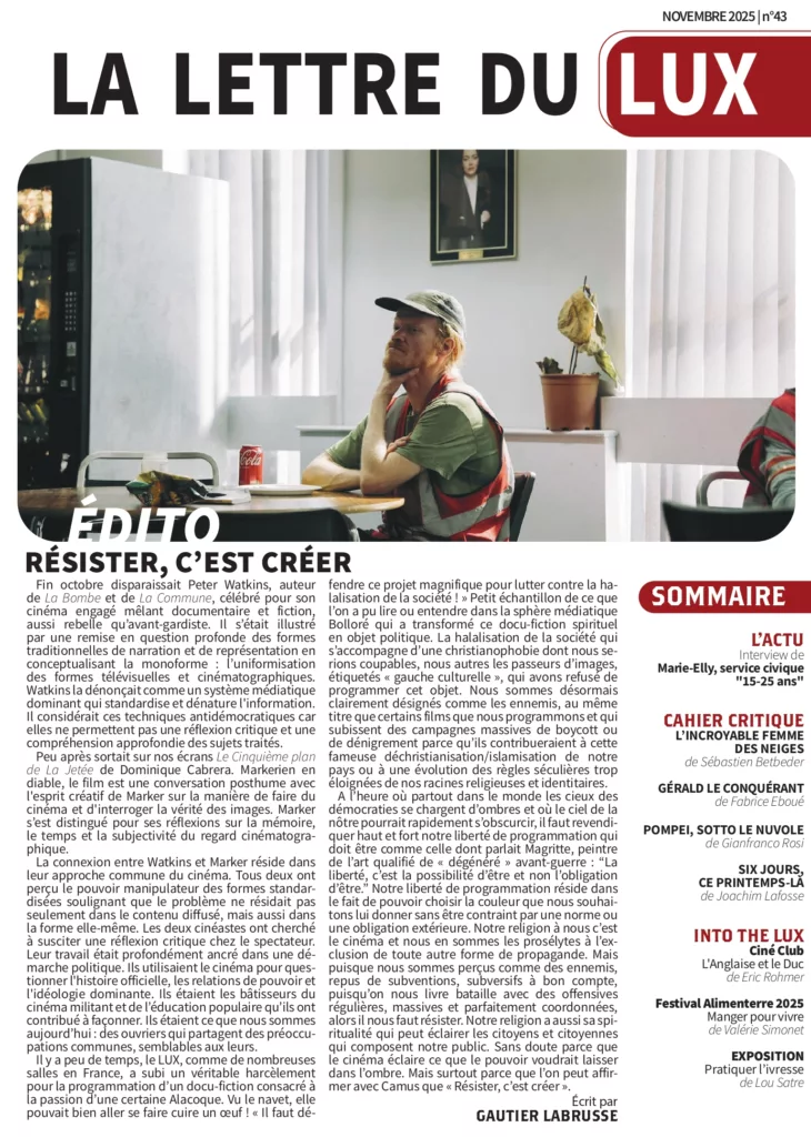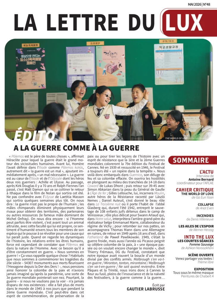 Cette lettre d’informations du Cinéma LUX a été mise en place début 2014 à l’initiative du Conseil d’Administration de l’association Cinéma LUX. Elle est rédigée par les adhérents de l’association. Elle se veut un complément au programme hebdomadaire et un lien supplémentaire entre l’équipe du Cinéma LUX et son public. Après une pause de 2 ans et demi pour cause de pandémie… elle revient maintenant tous les mois !