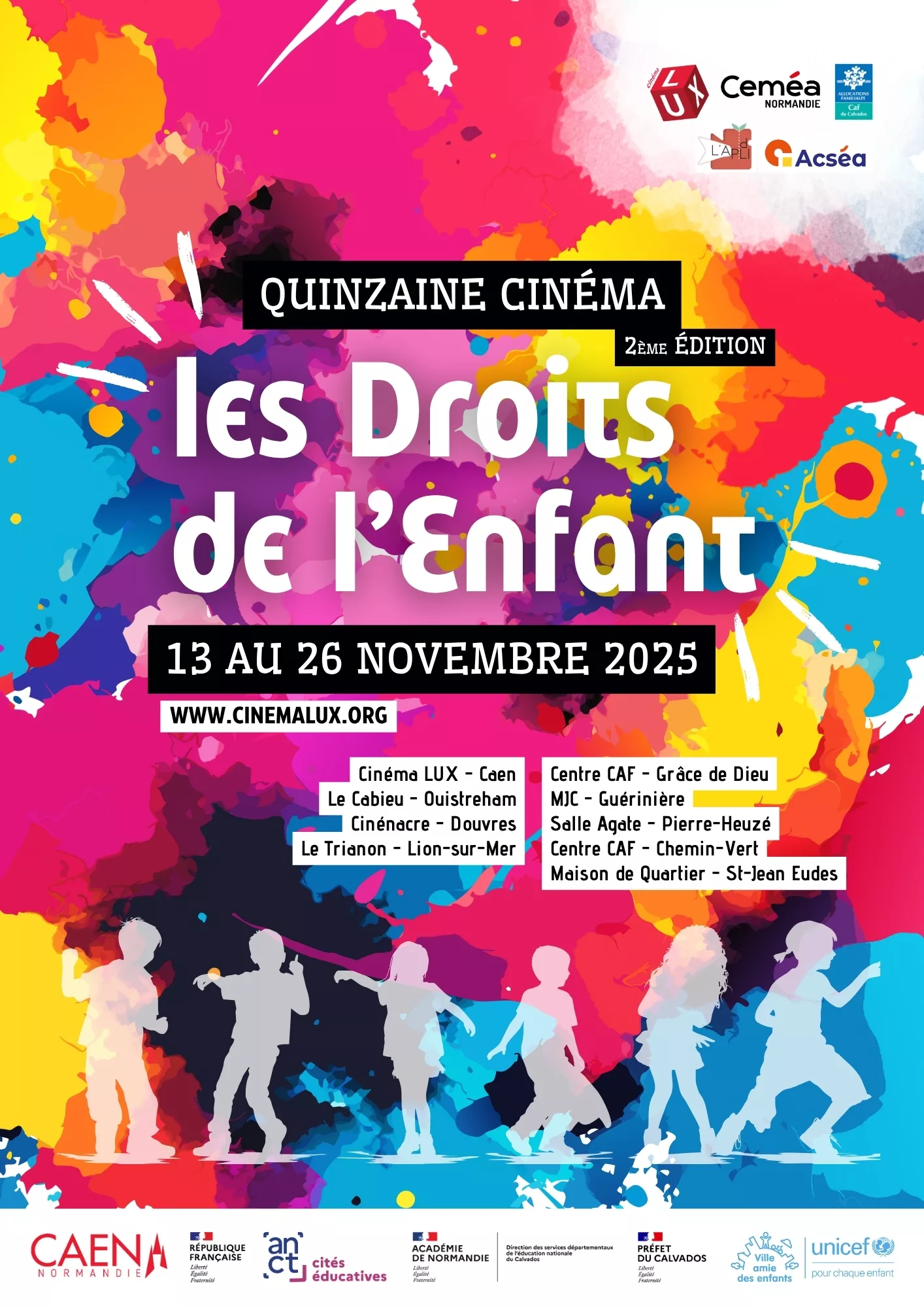 D’une envie et suggestion de Laurence Dumont, ex-députée du Calvados, défenseuse des Droits de l’Enfant, est née une quinzaine cinéma autour de cette thématique. Nous remercions tous les partenaires pour leur implication dans l’organisation de cet évènement. Les séances à Caen bénéficient d’un financement Cité Éducative Caennaise et font partie des actions que mènent le Cinéma LUX auprès des quartiers prioritaires dans le cadre de la Politique de la Ville. Cet évènement est soutenu par Unicef dans le cadre du label “Caen – Ville amie des Enfants”. Les programmes de court-métrages ont été imaginé en lien avec les CEMEA de Normandie et les Échos du Festival International du Film d’Éducation de Evreux.