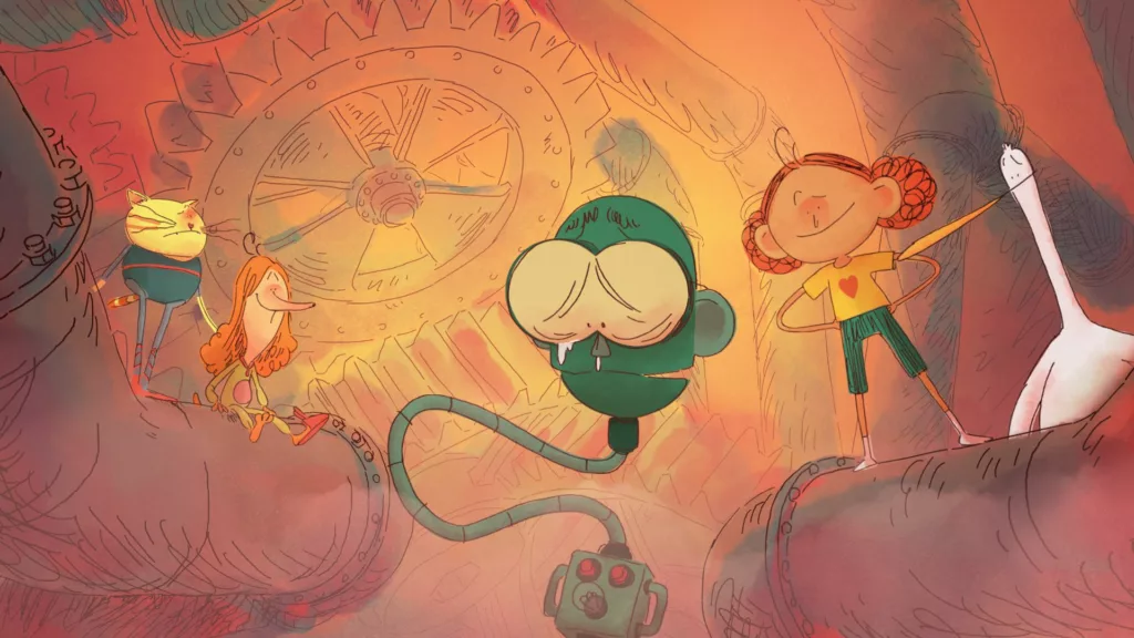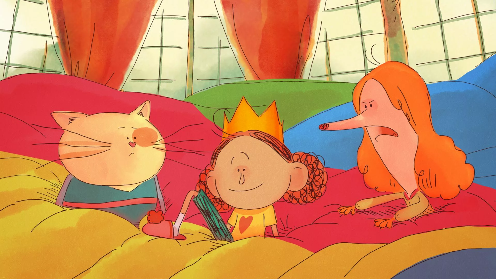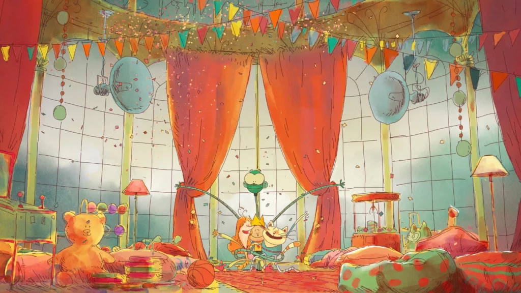 La Grande rêvasion de Rémi Durin (France, Belgique, 2025, 26′) : Alors que le spectacle de l’école va commencer et que les applaudissements du public résonnent, Andréa n’ose pas rejoindre ses camarades sur scène. Pour se cacher, elle file s’enrouler dans une cape de fortune dont le tissu semble interminable. Elle en ressort finalement dans un magnifique palais, entouré d’un nuage aussi moelleux qu’impénétrable.