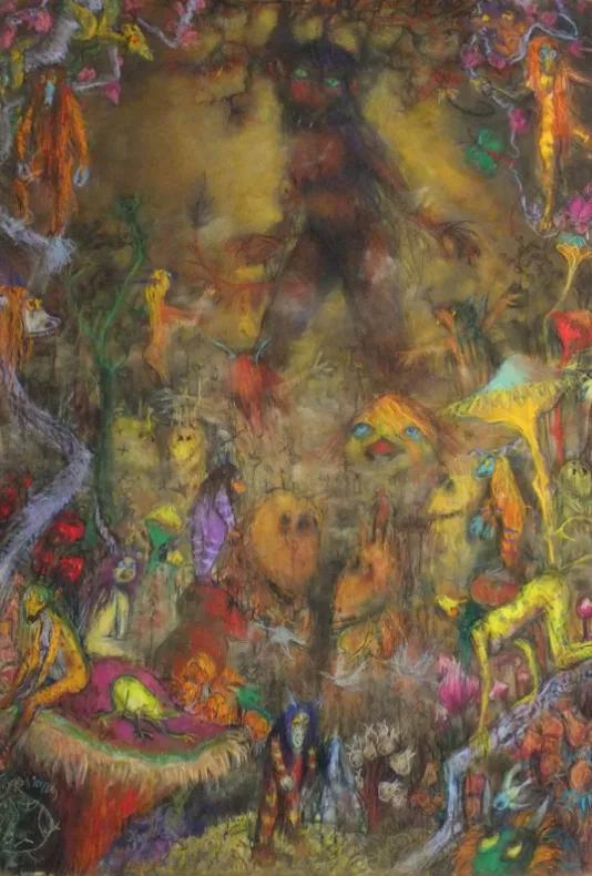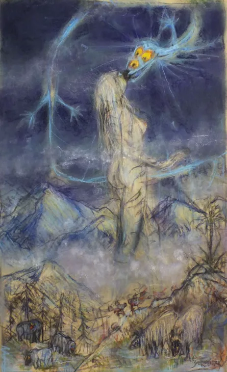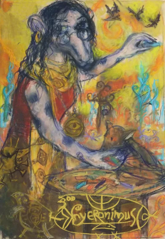 En 2011, j’ai abandonné les personnages à visage humain, pour un art qui ne soit pas anthropocentré . Parler de l’humanité, c’est très bien mais il y aussi autre chose. Je veux provoquer la sensation de mystère et d’être ailleurs. Ce monde est aussi un autre univers avec ses lois physiques et ses divinités. Ce monde a vu naître sa faune, sa flore, ses paysages, ses villes et ses peuples. J’aime suggérer du sens sans le révéler, d’où les écritures, les rites ou les signes.